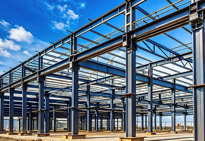 Steel plates are joined into I-beam structures using automatic assembling lines that ensure dimensional accuracy and alignment.