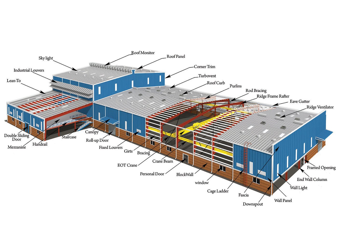 These buildings are constructed using high-strength steel for the main frame (columns and beams), with secondary components like purlins, girts, and metal panels forming the roof and walls. Every element is engineered to meet specific load, climate, and usage requirements, ensuring safety, efficiency, and longevity.